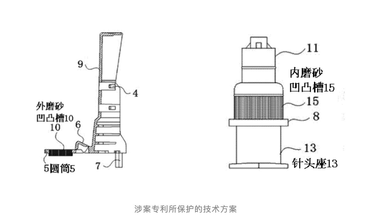 揚(yáng)州美德萊公司主張:該區(qū)別技術(shù)特征所起的作用“并非僅是增加安全針套連接段與圓筒之間的摩擦力”,還具有“可以使醫(yī)生將套筒旋轉(zhuǎn)時(shí)手感更加清晰,便于醫(yī)生快速將套筒旋轉(zhuǎn)到合適的位置”這一額外效果,現(xiàn)有證據(jù)沒(méi)有針對(duì)該額外效果給出技術(shù)啟示。在無(wú)效宣告程序及二審?fù)忂^(guò)程中,專(zhuān)利權(quán)人均當(dāng)庭演示了其所聲稱(chēng)“專(zhuān)利產(chǎn)品”實(shí)物,實(shí)物的圓筒與針頭座之間設(shè)有磨砂凹凸槽,在二者相對(duì)轉(zhuǎn)動(dòng)時(shí)確實(shí)有“咔噠咔噠”的清晰手感(即前述額外效果)。國(guó)家知識(shí)產(chǎn)權(quán)局支持專(zhuān)利權(quán)人主張維持涉案專(zhuān)利有效。