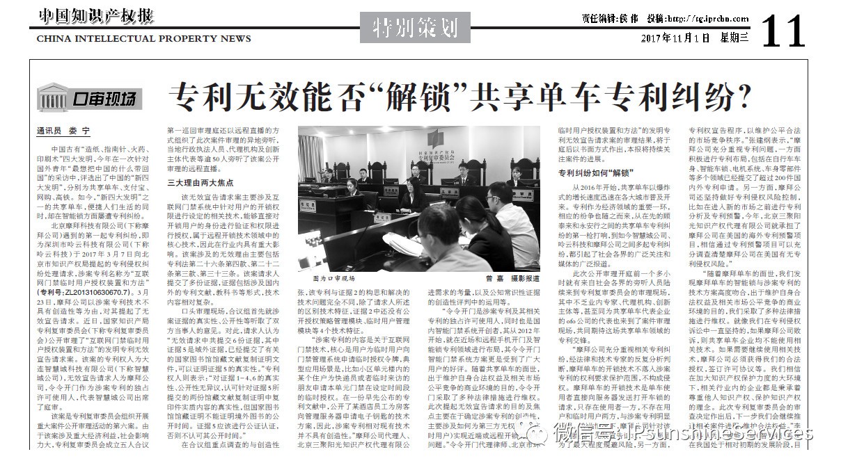 9月27日,專利復(fù)審委員會組織對該案進(jìn)行公開審理。該案是專利復(fù)審委員會組織開展重大案件公開審理活動的第六案。由于該無效宣告請求案主要涉及互聯(lián)網(wǎng)門禁系統(tǒng)中針對用戶的開鎖權(quán)限進(jìn)行設(shè)定的相關(guān)技術(shù),能夠直接對開鎖用戶的身份進(jìn)行驗(yàn)證和權(quán)限進(jìn)行授權(quán),屬于遠(yuǎn)程開鎖技術(shù)領(lǐng)域中的核心技術(shù),因此在行業(yè)內(nèi)具有重大影響,涉及重大經(jīng)濟(jì)利益,社會影響力大,專利復(fù)審委員會成立五人合議組對其進(jìn)行審理,合議組成員由相關(guān)技術(shù)領(lǐng)域?qū)彶闃I(yè)務(wù)專家及法律專家擔(dān)任。三聚陽光張建綱、周美華、吳黎三位律師出庭參審。近100人現(xiàn)場旁聽了該案審理?!吨袊R產(chǎn)權(quán)報(bào)》11月1日刊發(fā)題為《專利無效能否“解鎖”共享單車專利糾紛?》的文章,專題報(bào)道了該案。