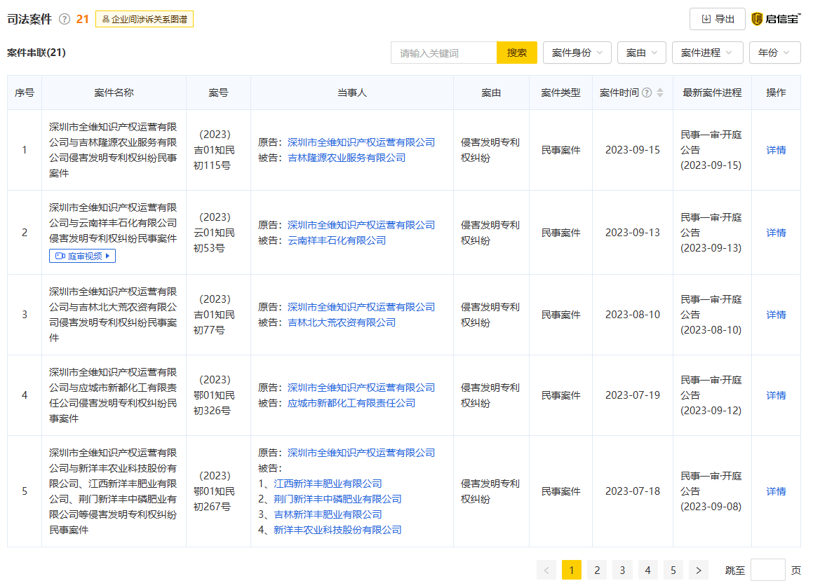 隨后,全維公司以此為“武器”,自2020年起,針對(duì)廣東、湖北、四川、福建、山東等地的二十余家復(fù)合肥生產(chǎn)企業(yè)發(fā)起了密集的專(zhuān)利侵權(quán)訴訟,索賠金額從100萬(wàn)元到1000萬(wàn)元不等,甚至要求企業(yè)拆除生產(chǎn)設(shè)備。