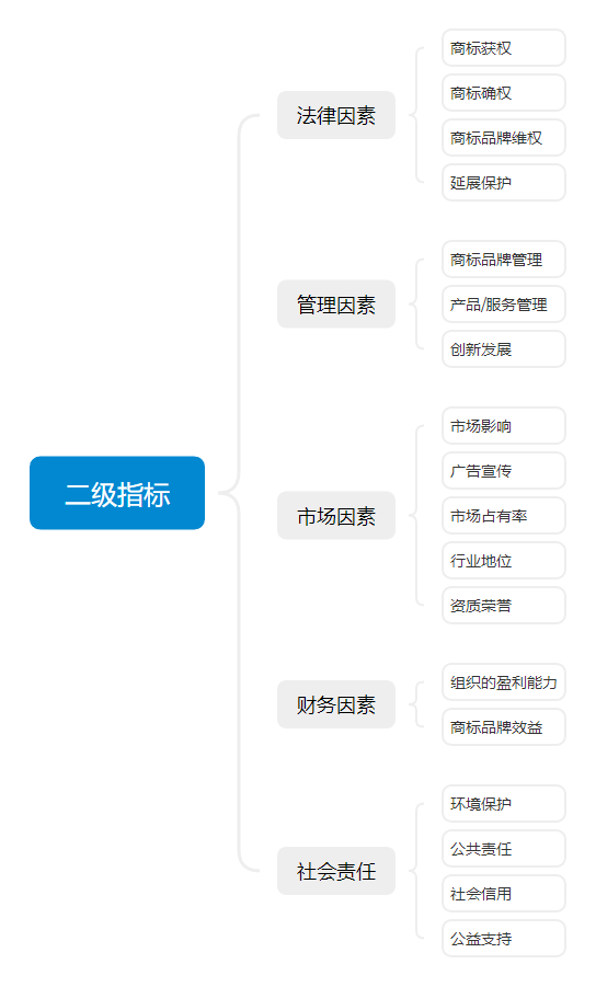·二級與三級指標(biāo):在一級指標(biāo)下,進(jìn)一步細(xì)分為18個(gè)二級指標(biāo)和41個(gè)三級指標(biāo),對商標(biāo)的注冊與保護(hù)情況、品牌管理制度、市場影響力、廣告宣傳、盈利能力、社會(huì)信用等進(jìn)行全方位、系統(tǒng)化的綜合評價(jià)。
