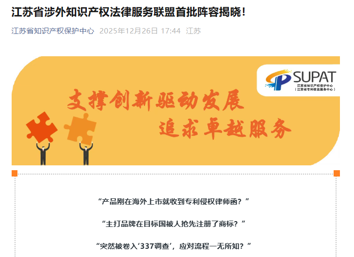 近日,三聚陽光正式加入江蘇省涉外知識產(chǎn)權(quán)法律服務(wù)聯(lián)盟。該聯(lián)盟面向江蘇企業(yè)