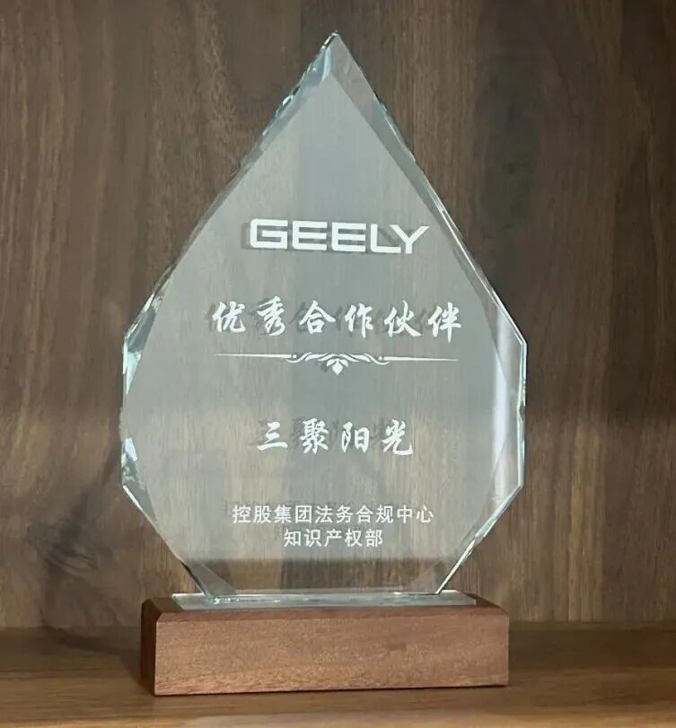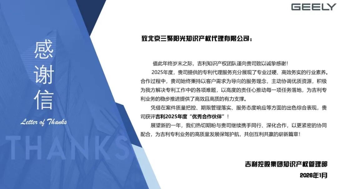 近日,三聚陽光收到吉利控股集團(tuán)知識產(chǎn)權(quán)管理部發(fā)來的感謝信。信中對三聚陽光在2025年度為吉利提供的專利代理服務(wù)給予高度評價,并授予吉利控股集團(tuán)2025年度“優(yōu)秀合作伙伴”獎杯。
