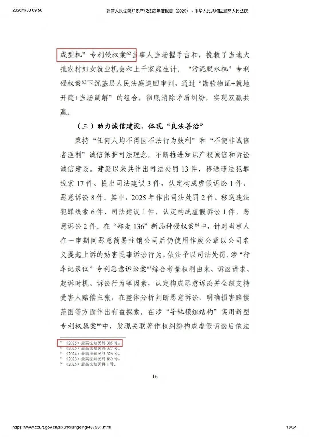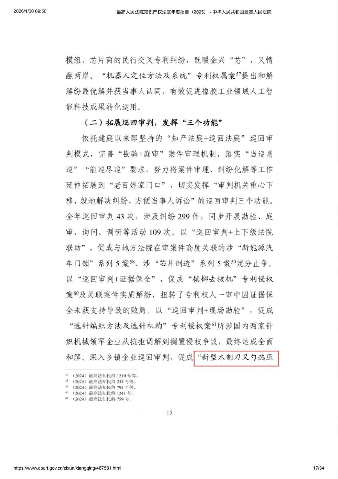 而在《報告》第二部分“做實(shí)定分止?fàn)?,以?shí)質(zhì)解紛促進(jìn)融合發(fā)展”中,三聚陽光代理的涉“一種新型木制刀叉勺熱壓成型機(jī)”侵權(quán)糾紛案【(2025)最高法知民終385號】被作為“巡回審判”的典范提及。