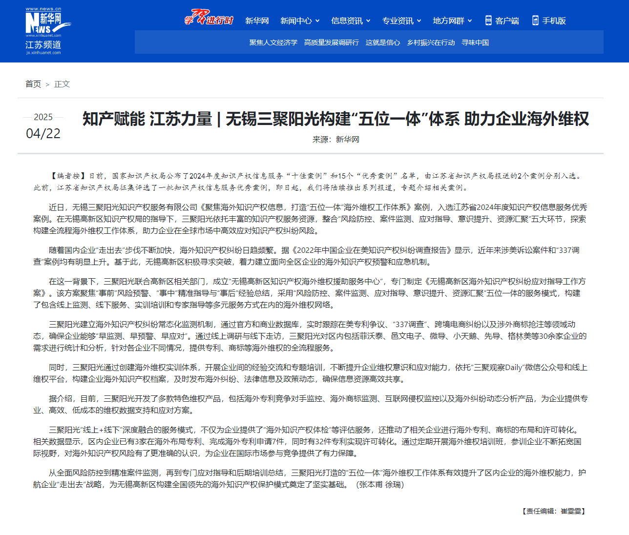 知產(chǎn)賦能 江蘇力量 | 無錫三聚陽(yáng)光構(gòu)建“五位一體”體系 助力企業(yè)海外維權(quán)